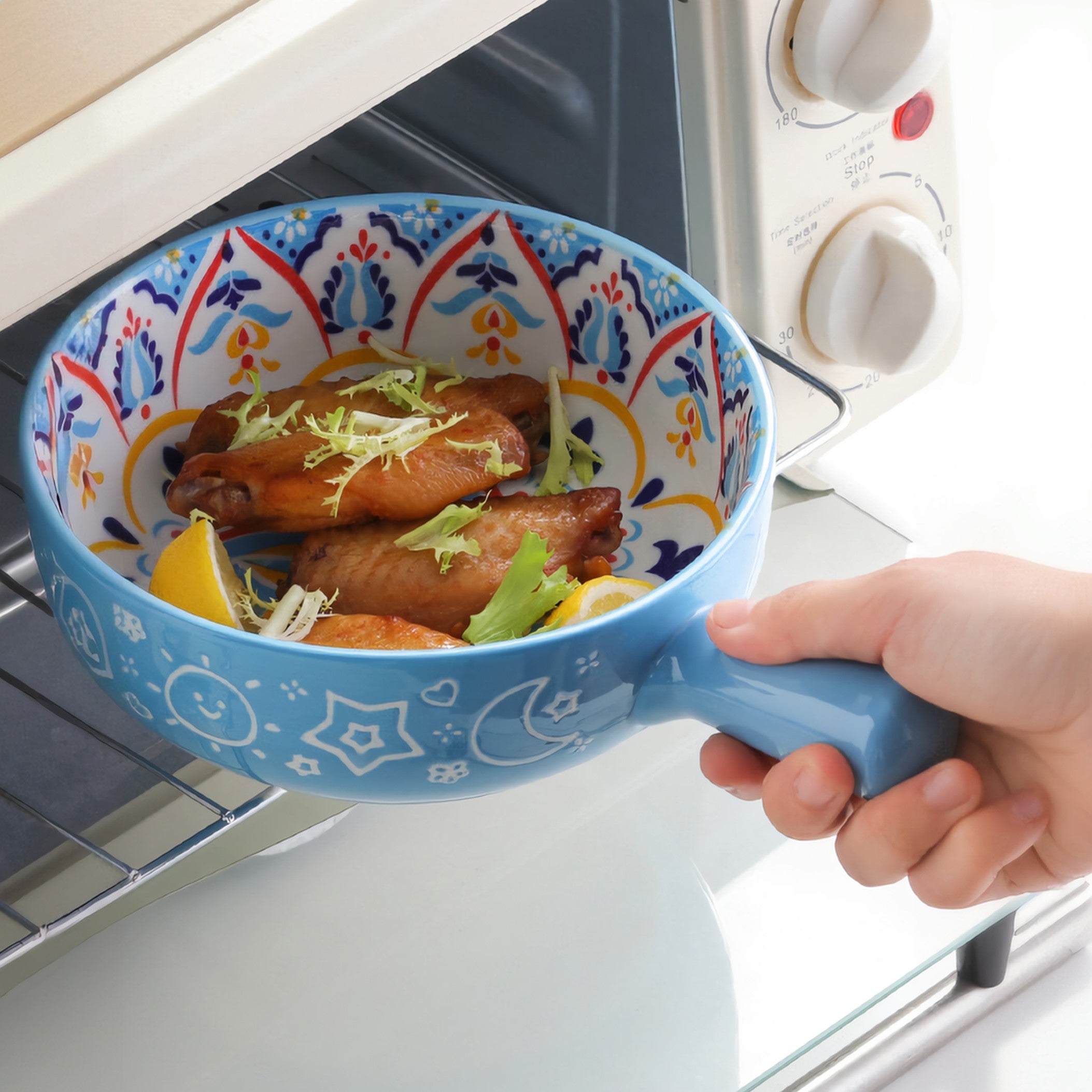 Ethnic Blue Round Ceramic Serving Platter with Handle Microwave & Dishwasher Safe