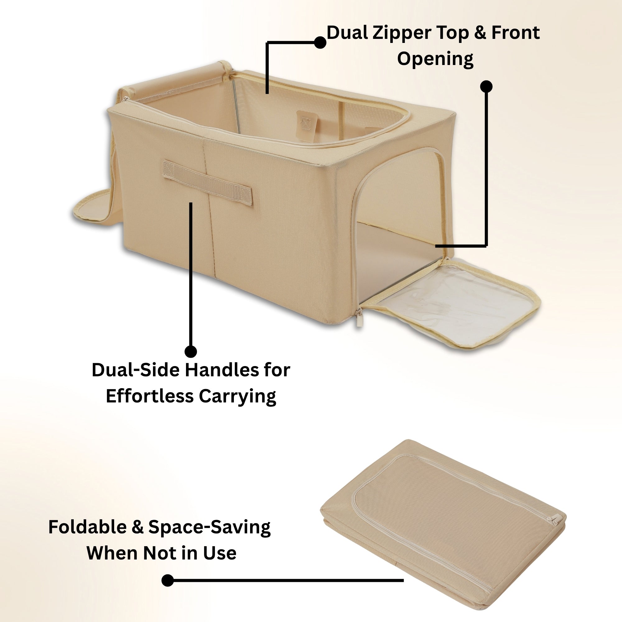 User-Friendly Design with Zippers & Handles: Dual sturdy zippers provide smooth access, while reinforced side handles allow easy lifting, pulling, and repositioning—even when fully loaded.