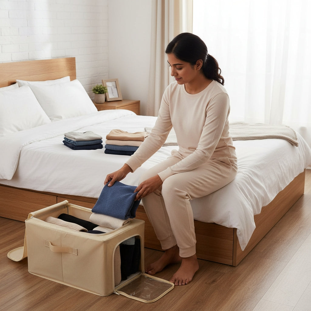 Its clear transparent window makes it easy to see what’s inside without opening it, while the dual zipper closure ensures your items remain dust-free and protected. With a 31-liter capacity, it’s perfect for organizing everything from sarees and kurtas to bedsheets, towels, kids' clothes, winterwear, and accessories. Whether you place it in your wardrobe, under the bed, on shelves, or in storage cabinets, this foldable box blends convenience with functionality.