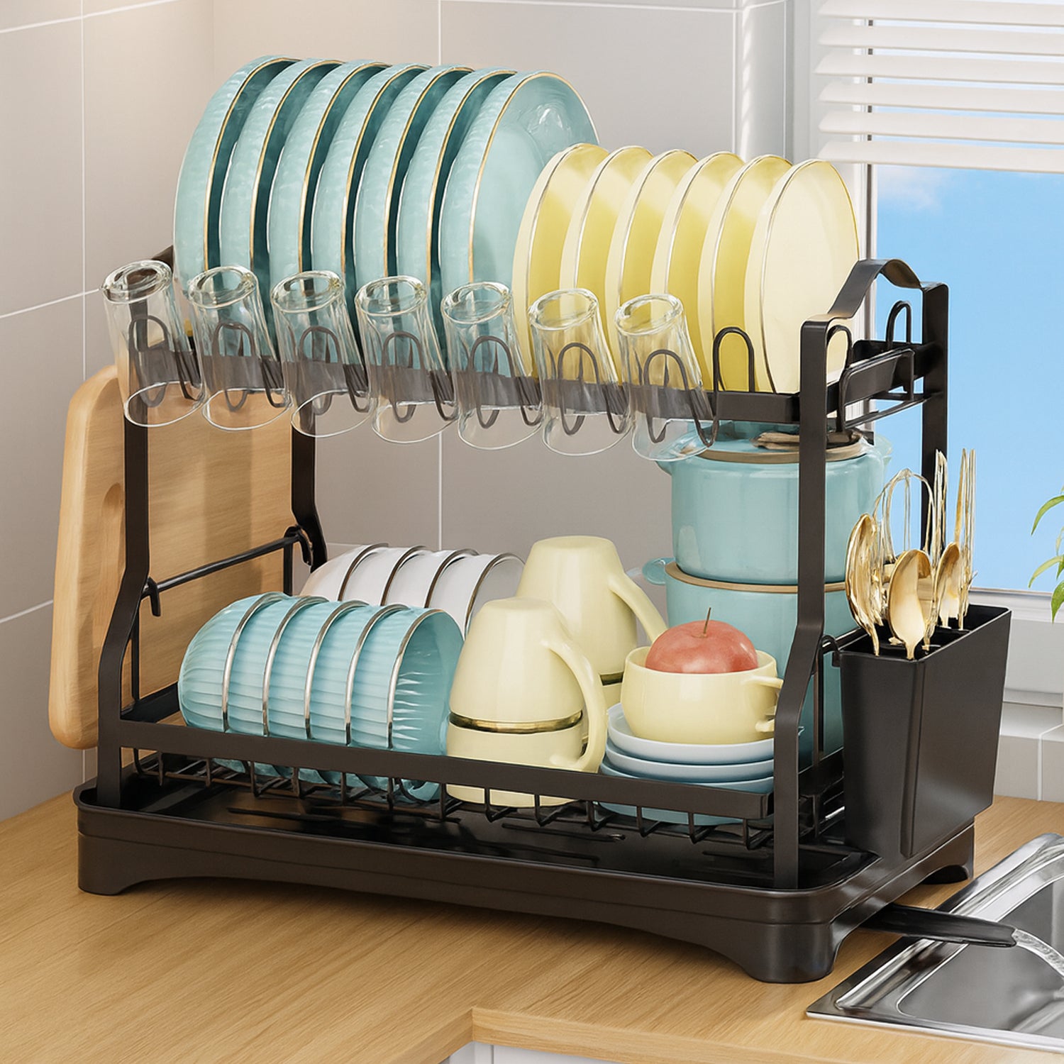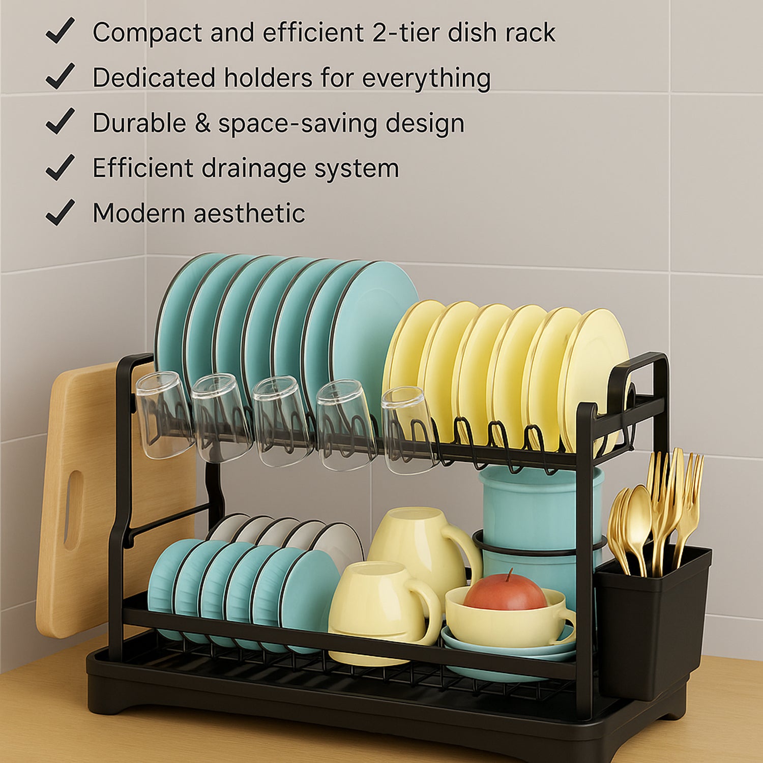 This Epicasa® storage is a compact and efficient 2-tier dish rack with dedicated compartments for plates, bowls, cups, utensils, and even a cutting board – keeping your kitchen counter clean and organized.
