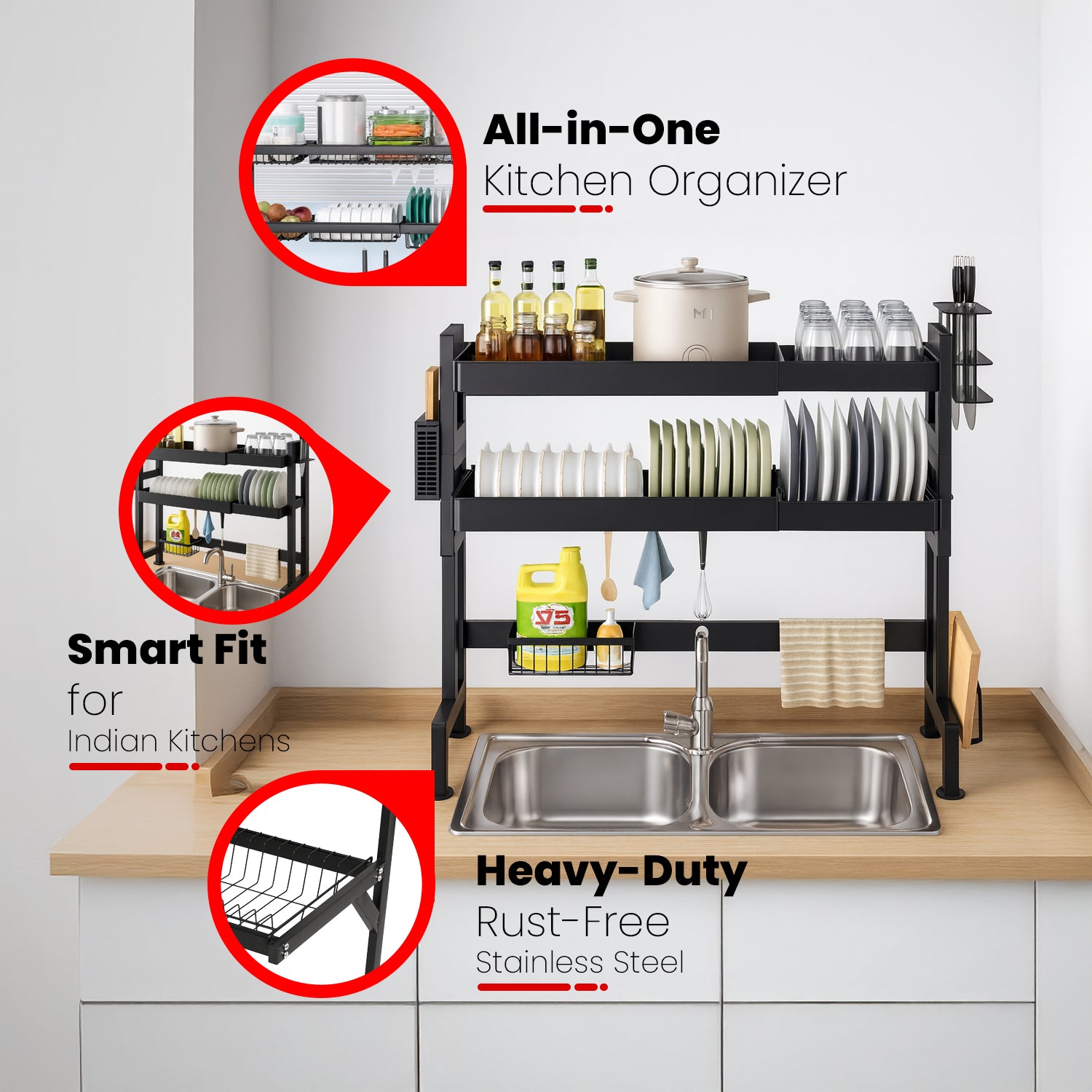 Designed to fit sinks up to 63.1 cm wide with a faucet clearance of 45 cm, this rack is ideal for standard Indian kitchen counters. Its vertical layout saves space while keeping everything within reach.
