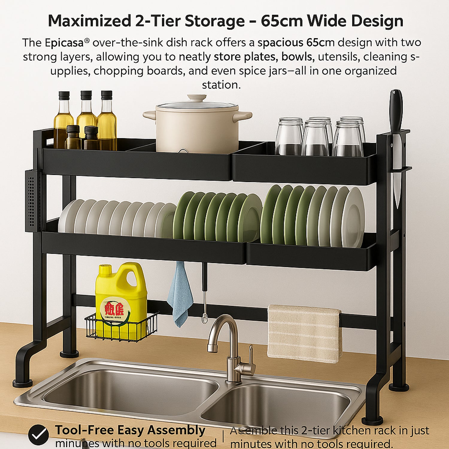 The Epicasa® over-the-sink dish rack offers a spacious 65cm design with two strong layers, allowing you to neatly store plates, bowls, utensils, cleaning supplies, chopping boards, and even spice jars—all in one organized station.
