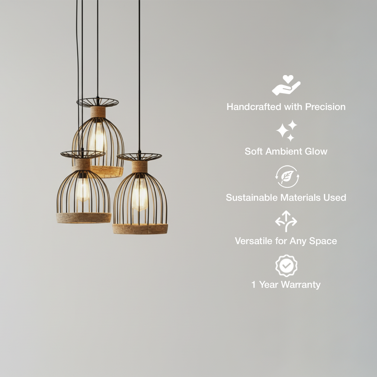 | Three-light cluster chandelier with open geometric black metal cages and warm wooden accents, creating a sculptural industrial-farmhouse statement Staggered hanging design pairs perfectly with Edison-style filament bulbs to cast a soft, vintage-inspired ambient glow Includes chandelier, holder, and wire for installation |