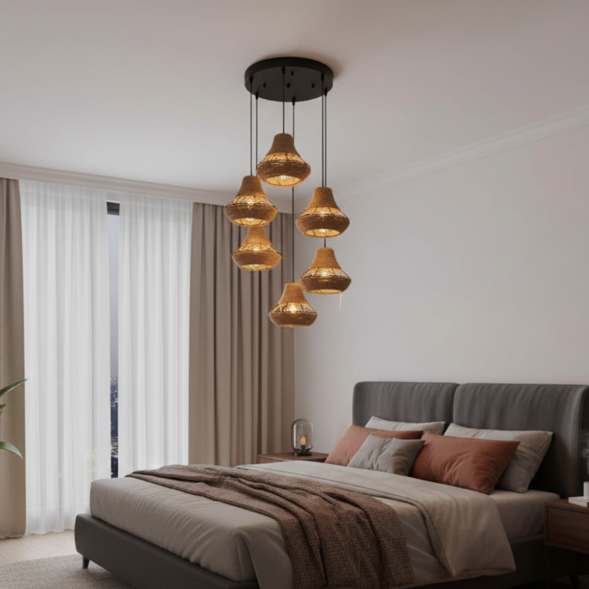 | Six-light cascading cluster with hand-woven jute shades for warm, ambient, sculptural lighting Organic rattan paired with a sleek black metal canopy- perfect for dining areas, entryways, or high ceilings Includes chandelier, holder, and wire for installation |