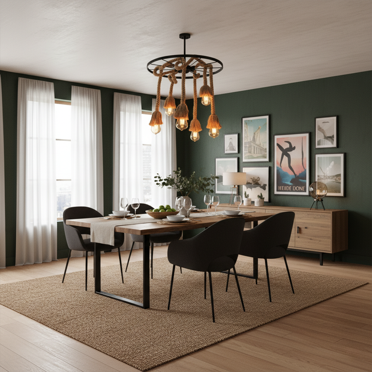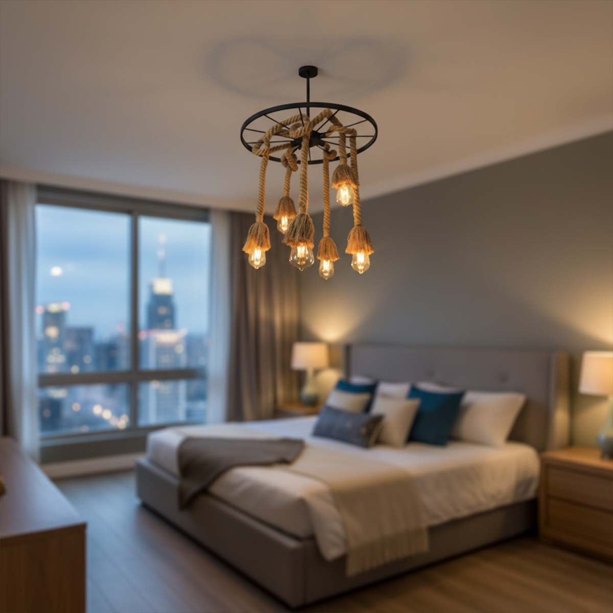 | Nautical–industrial design with a metal frame, jute rope detailing, and space for 6 Edison-style bulbs Mounted suspension allows adjustable height; perfect for dining rooms, lofts, farmhouse kitchens, or bars Includes chandelier, holder, and wire for installation |
