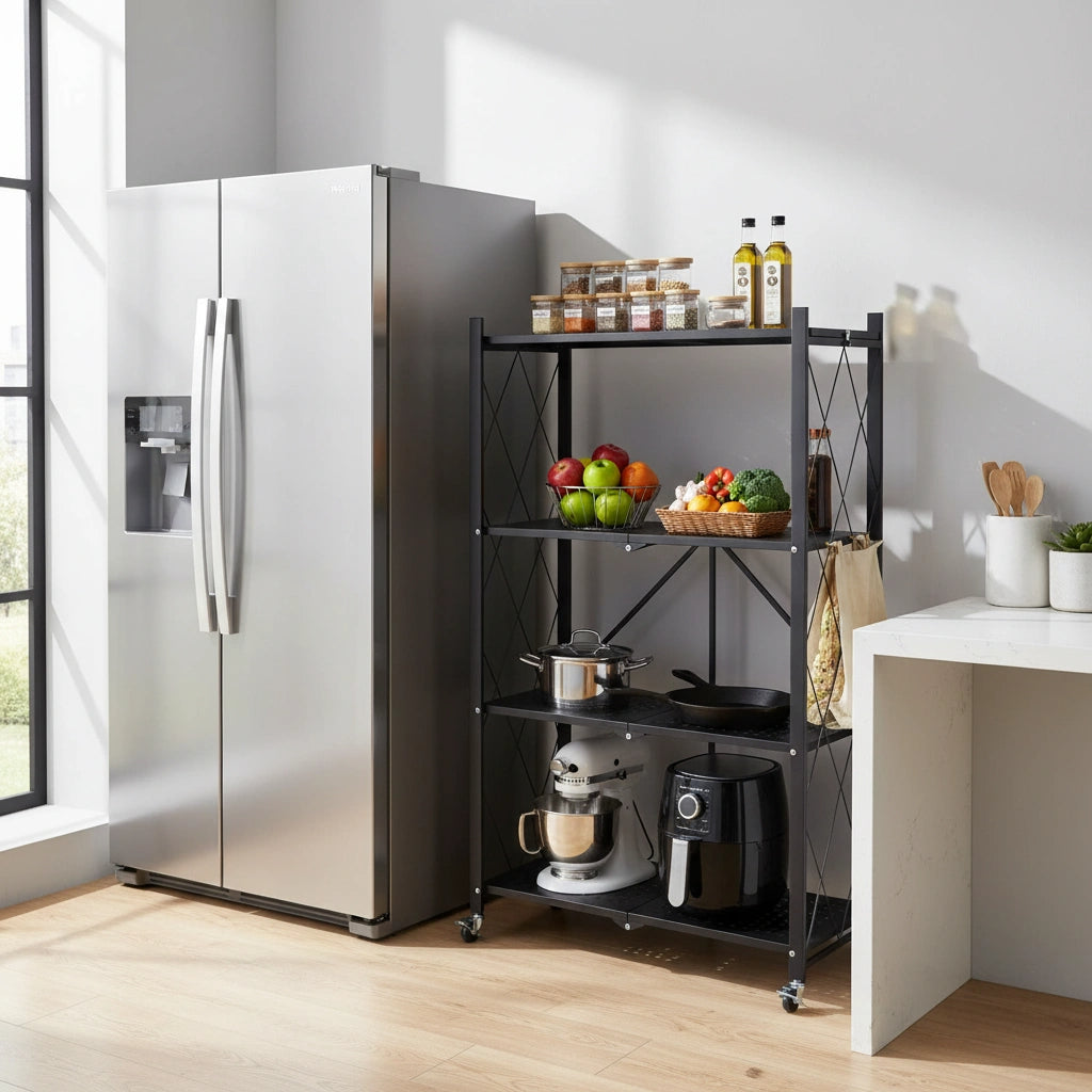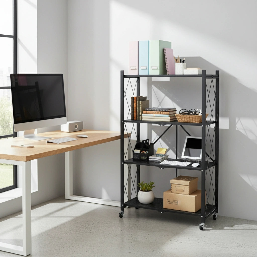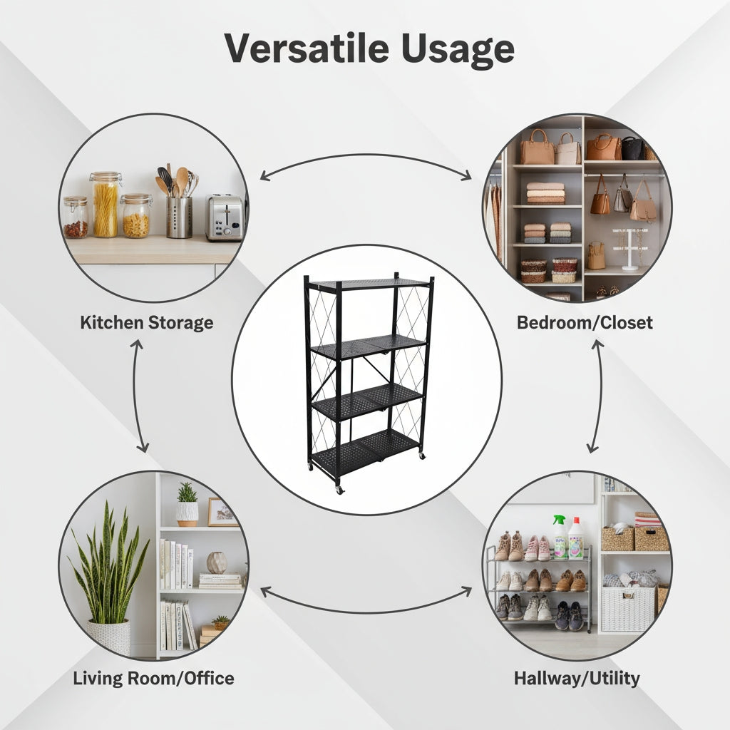 Upgrade your space with the Epicasa® Foldable 4-Tier Storage Rack, a perfect fusion of functionality, space-saving design, and modern aesthetics. Crafted from high-strength metal with thick shelves, this durable rack is ideal for storing household essentials, books, kitchenware, or office files.