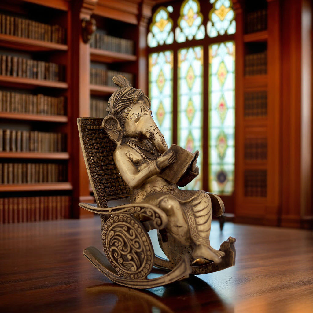 A Ganesha is reading Ramayana while sitting comfortably in a rocking chair. He has a tilak on his forehead of a trident. A wonderful statue for a reading room or an avid reader.