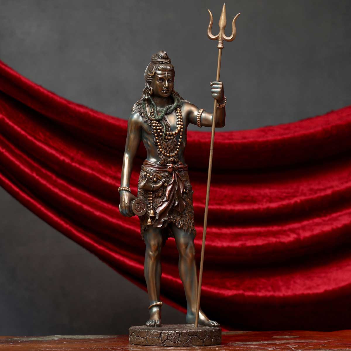 This unique statue portrays standing Lord Shiva with trident The Holy River Ganga, which flows out of Lord Shiva's matted locks, symbolises purity. The crescent moon symbolises peace and calmness. The Third Eye represents anger. Lord Shiva is called as "Mahadev" in light of the fact that they are God of gods.