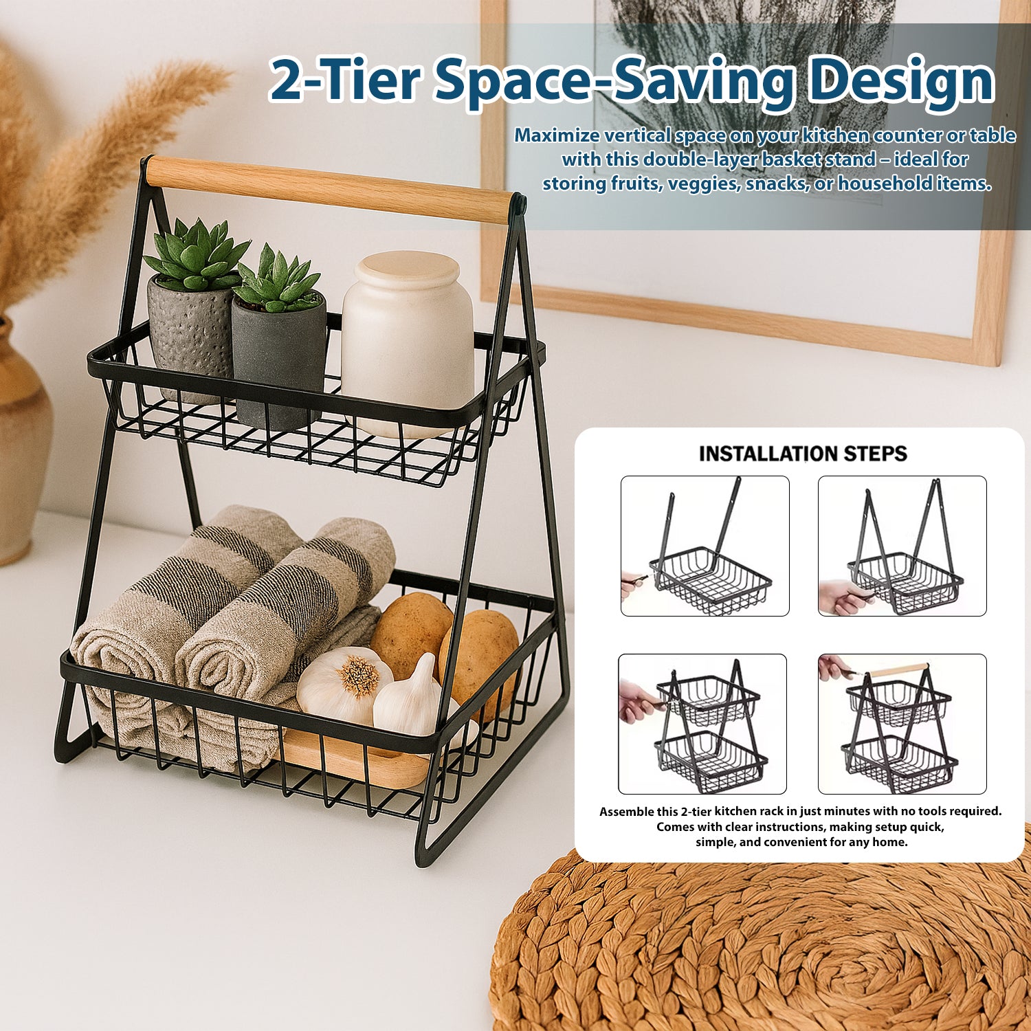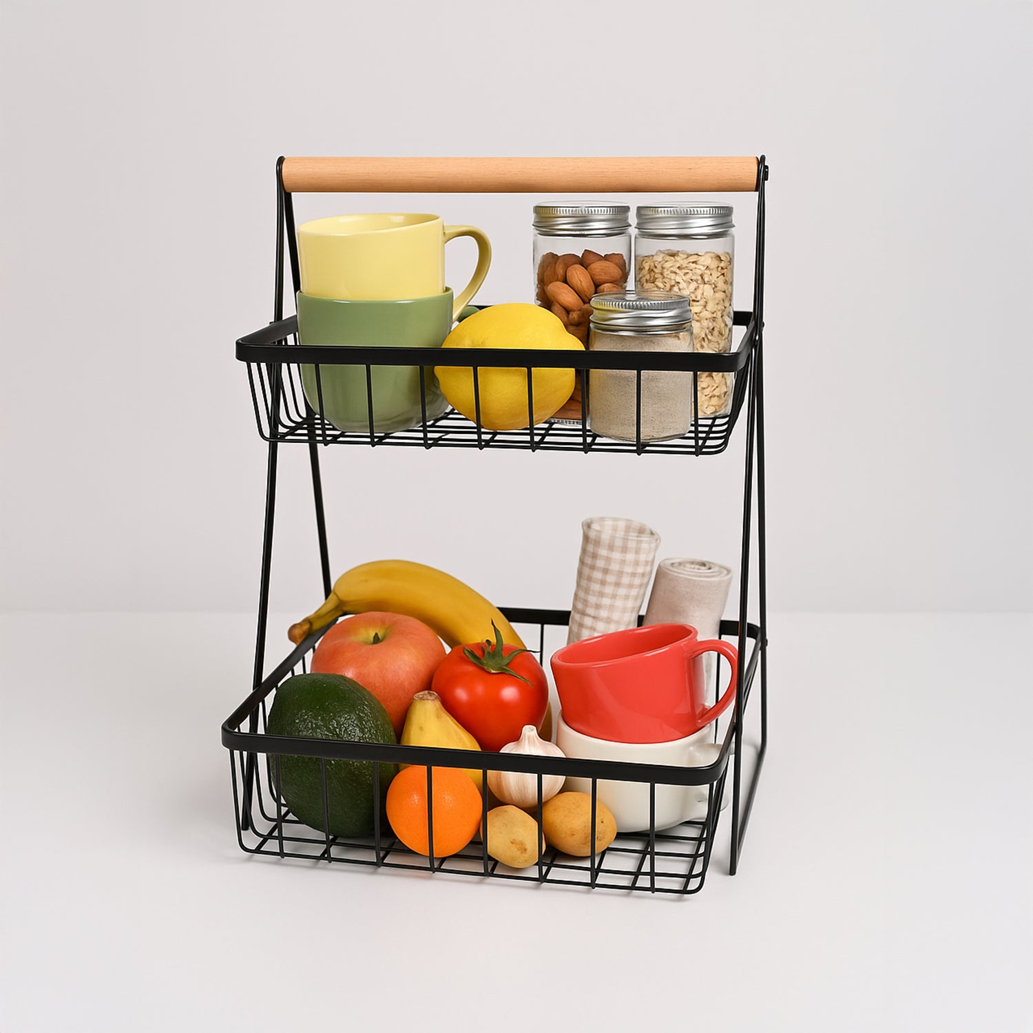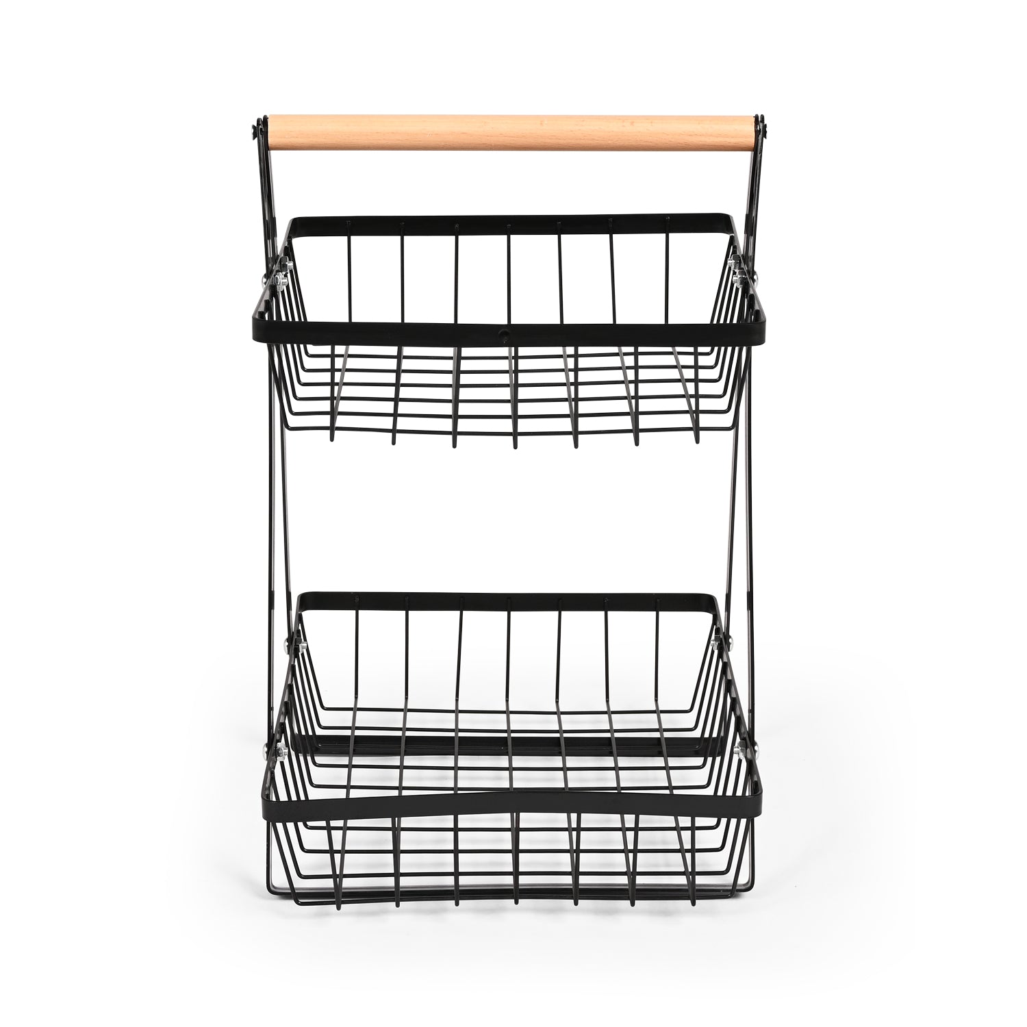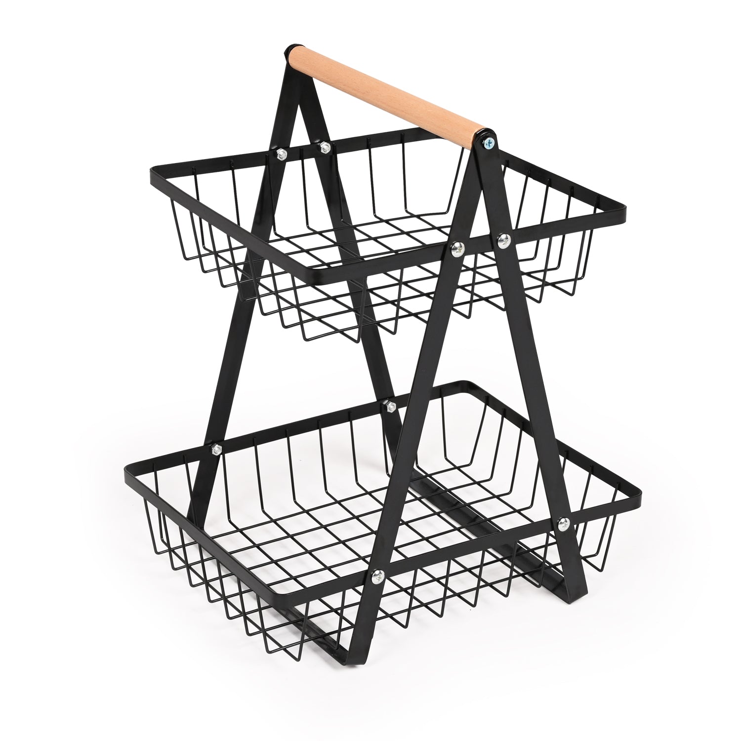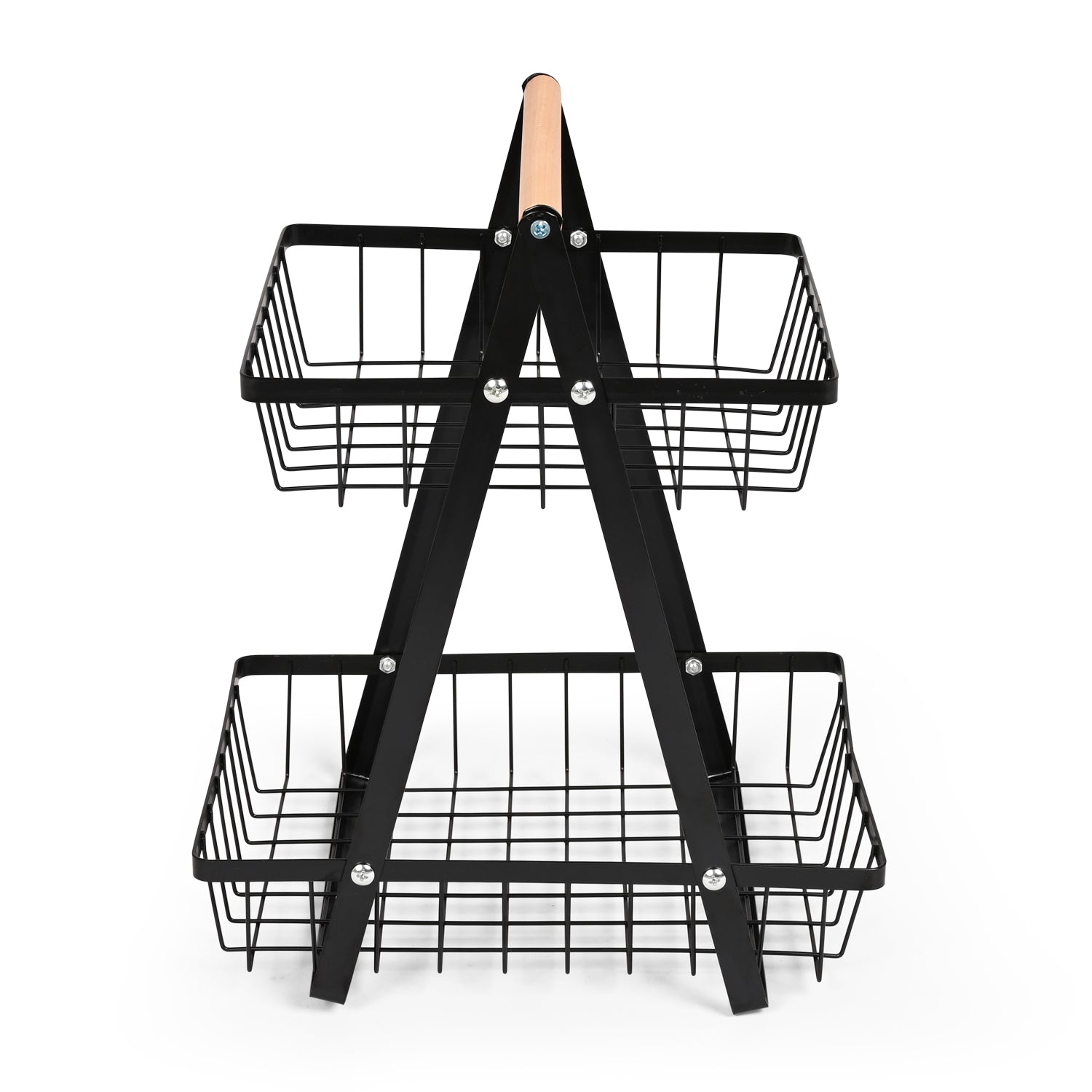 Crafted from durable black metal with open-grid baskets, it allows for proper air circulation to keep produce fresh longer. The wooden handle adds a warm, rustic touch and makes it easy to move wherever needed — from kitchen to living room, pantry to patio.