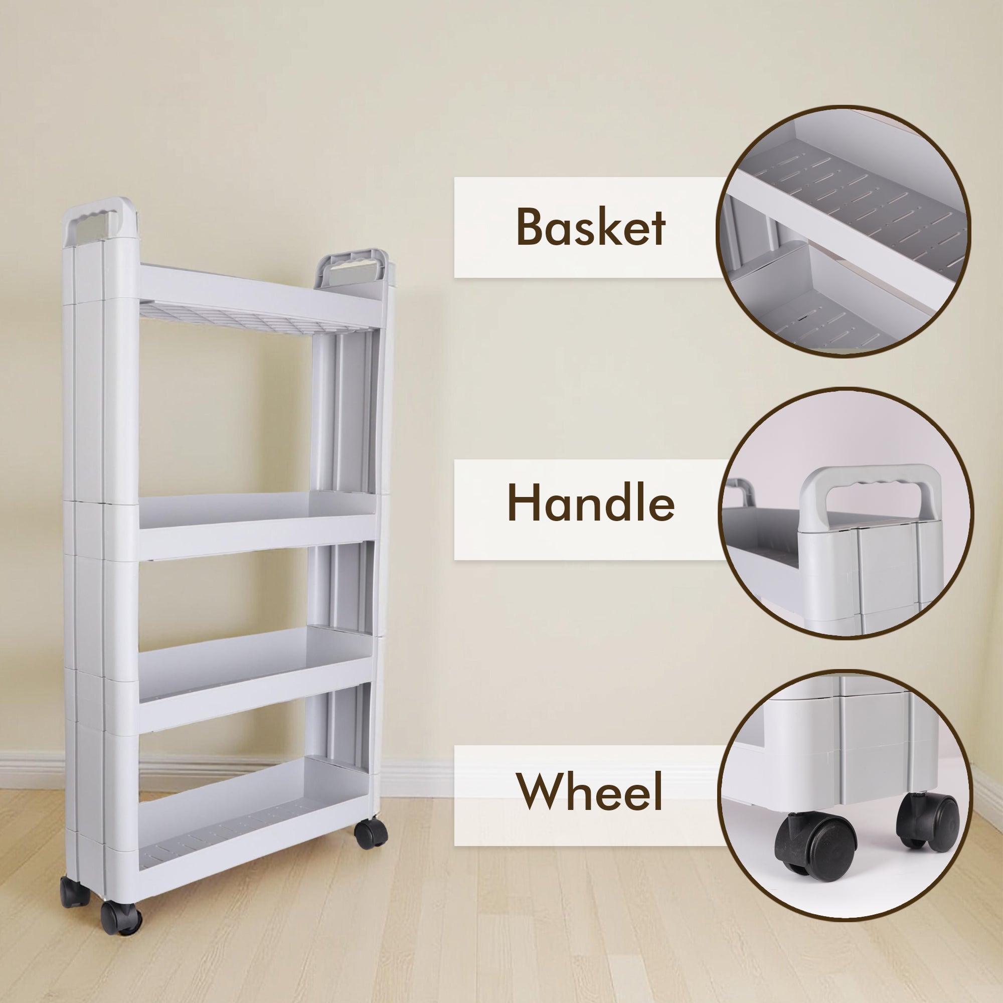 Crafted from premium quality plastic, it features ventilated baskets for airflow and moisture control. The 360° smooth-rolling wheels allow for effortless movement, making it convenient for any corner of your home—be it the kitchen, bathroom, bedroom, or office. Stylish, sturdy, and highly functional, this trolley is a must-have for smart storage.