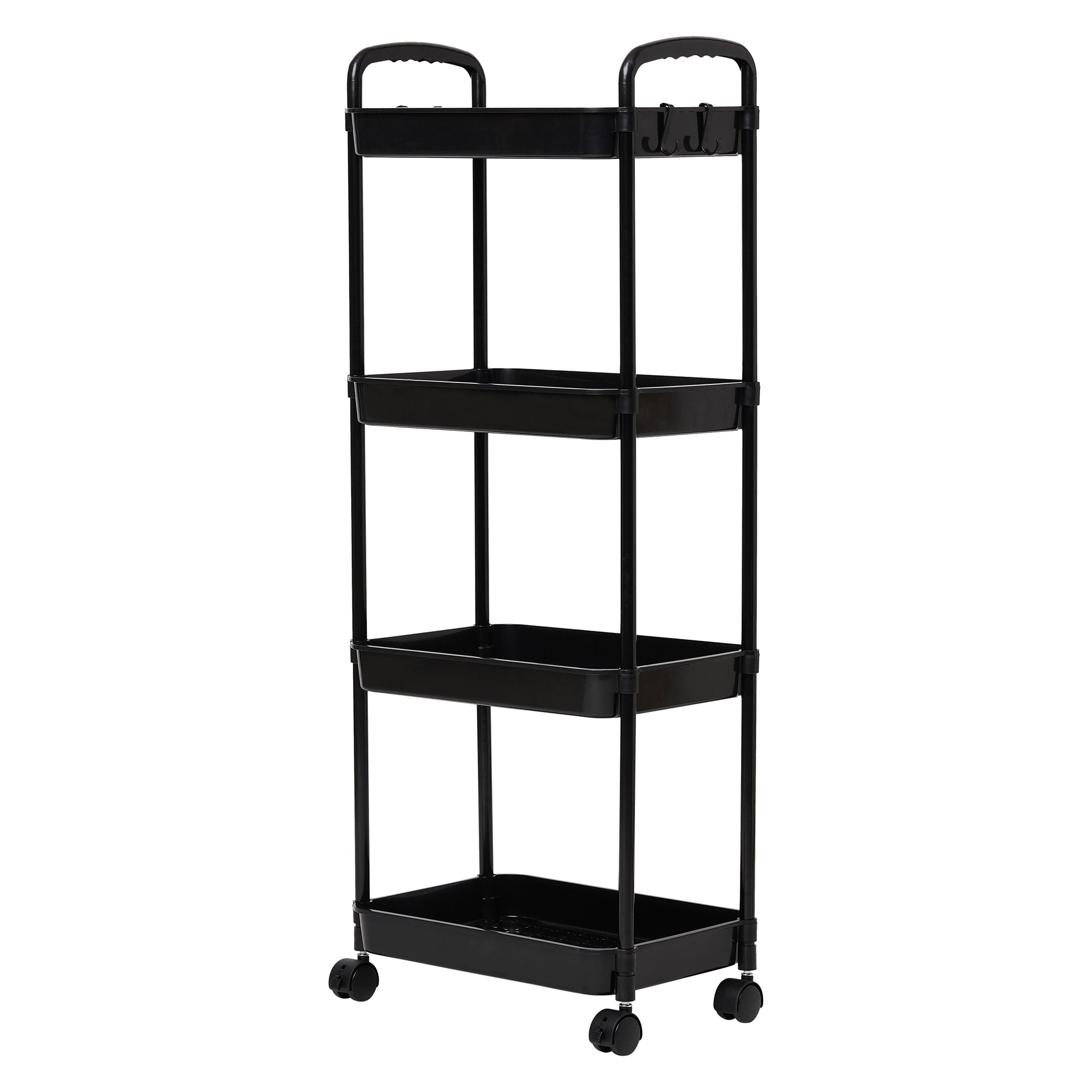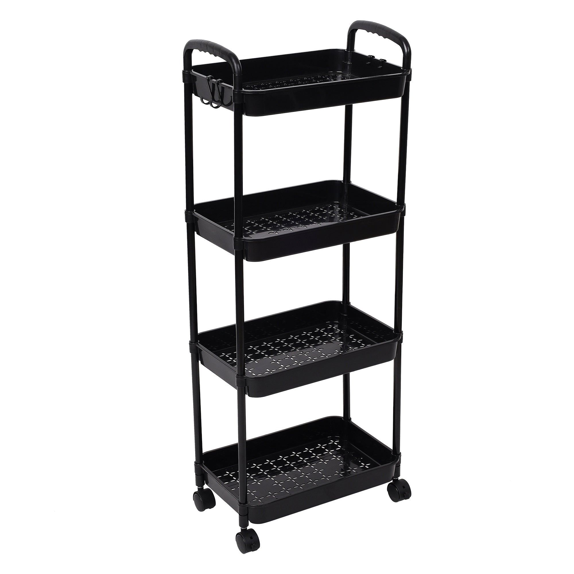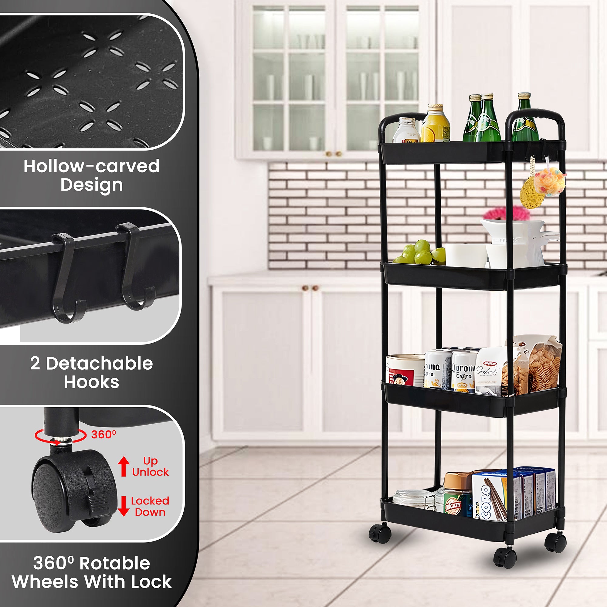 Designed with four deep and sturdy shelves, this cart provides ample space to neatly organize kitchen bottles, condiments, snacks, bathroom essentials, or even office supplies – keeping everything within easy reach.