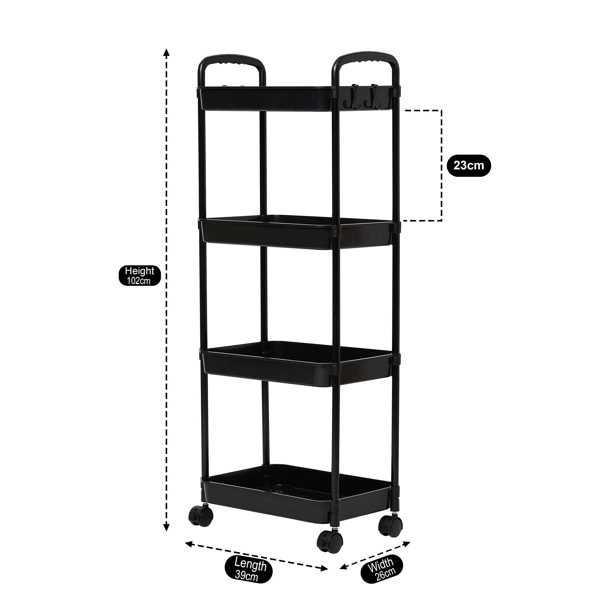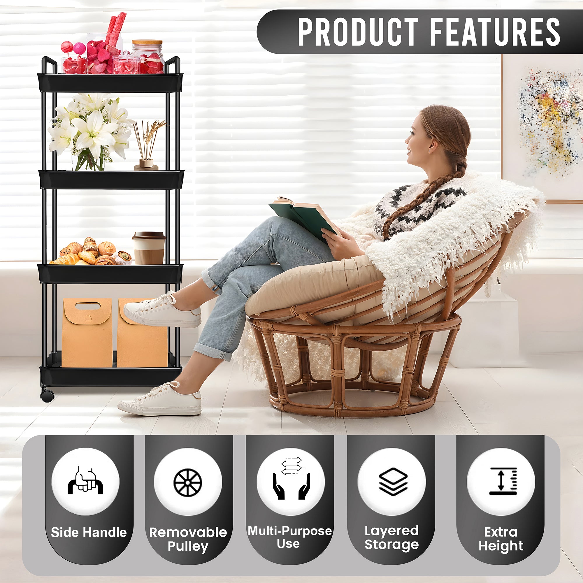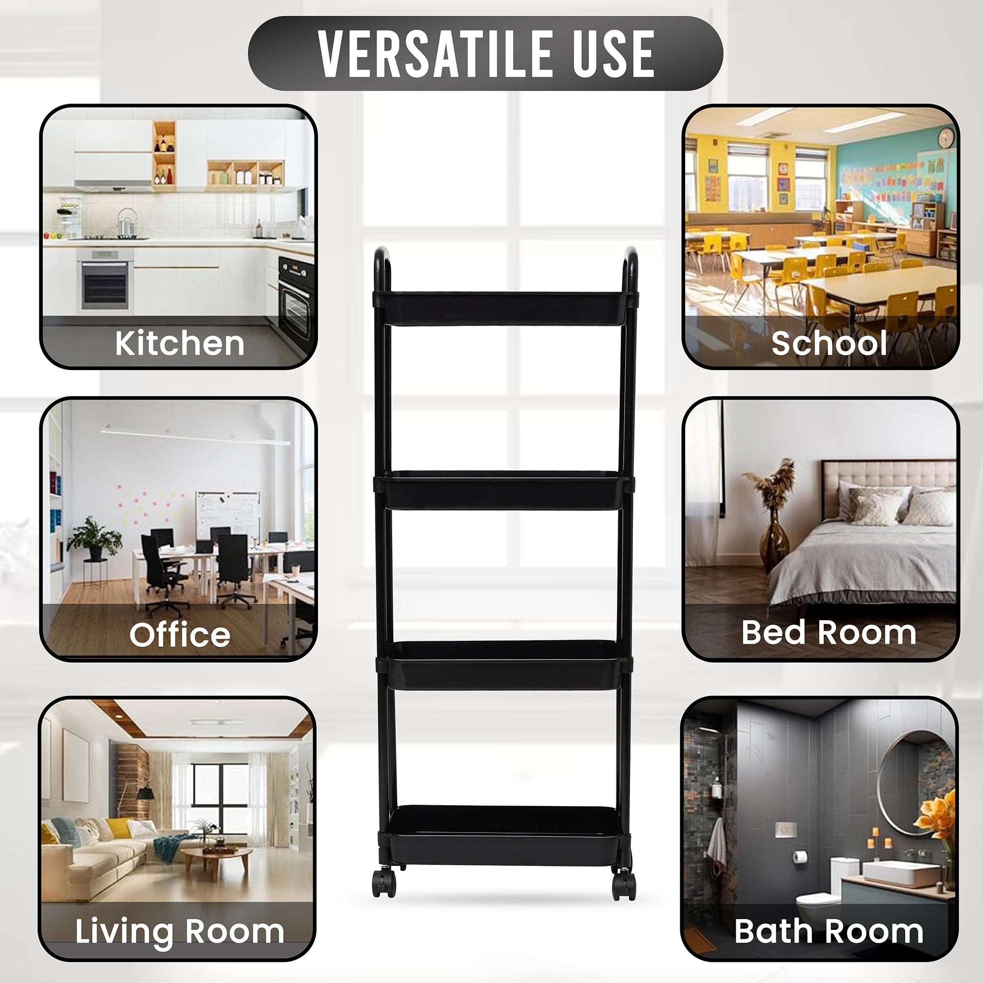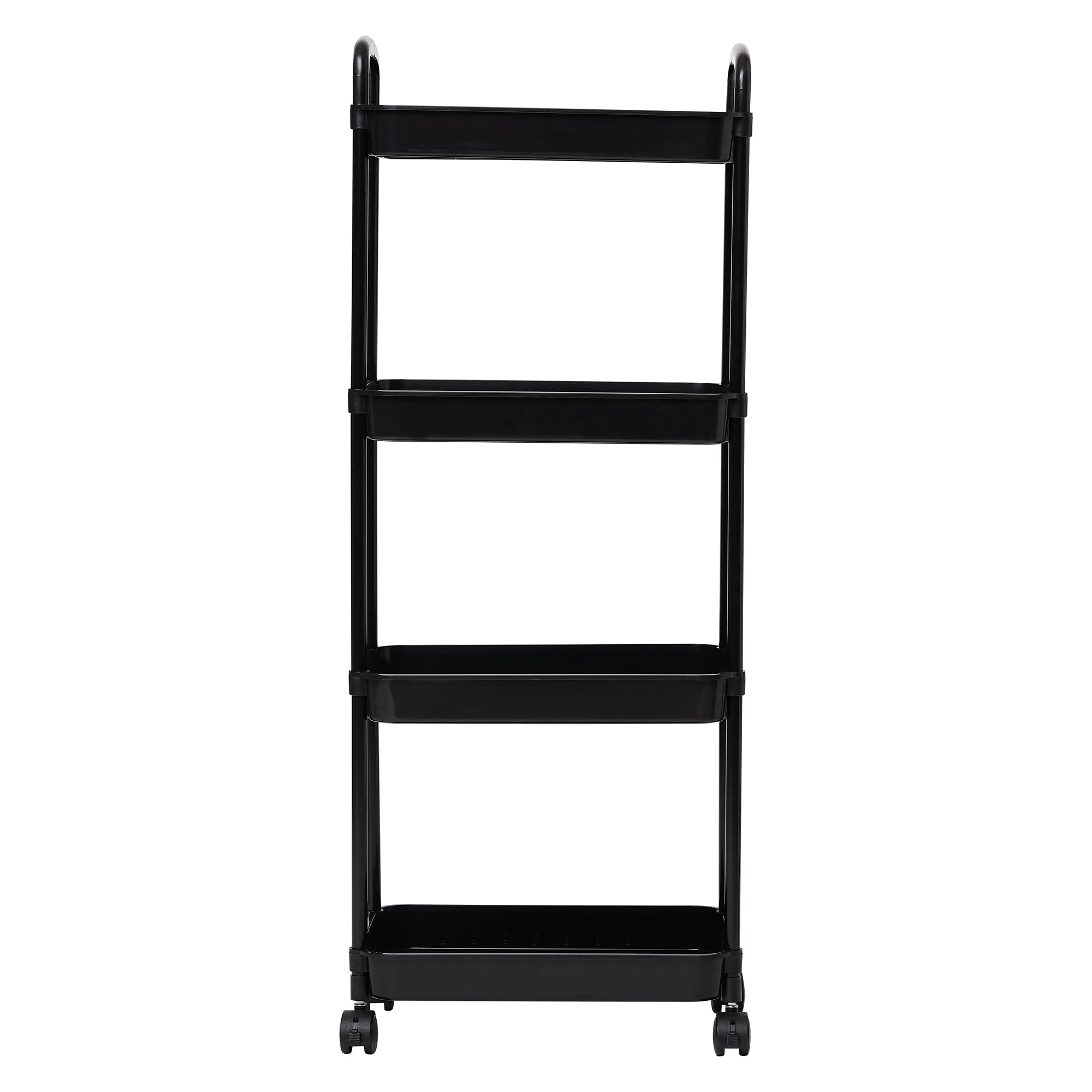 Designed with four deep and sturdy shelves, this cart provides ample space to neatly organize kitchen bottles, condiments, snacks, bathroom essentials, or even office supplies – keeping everything within easy reach.