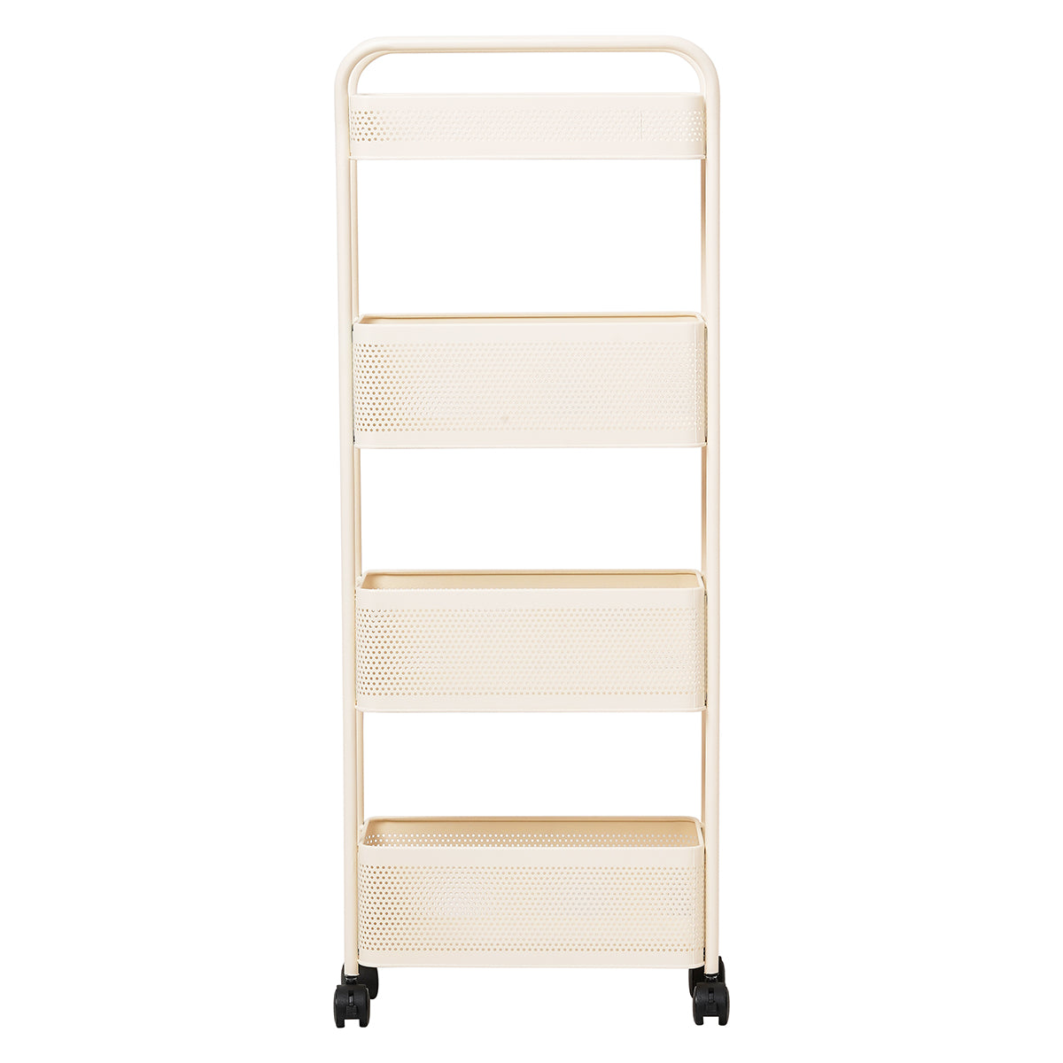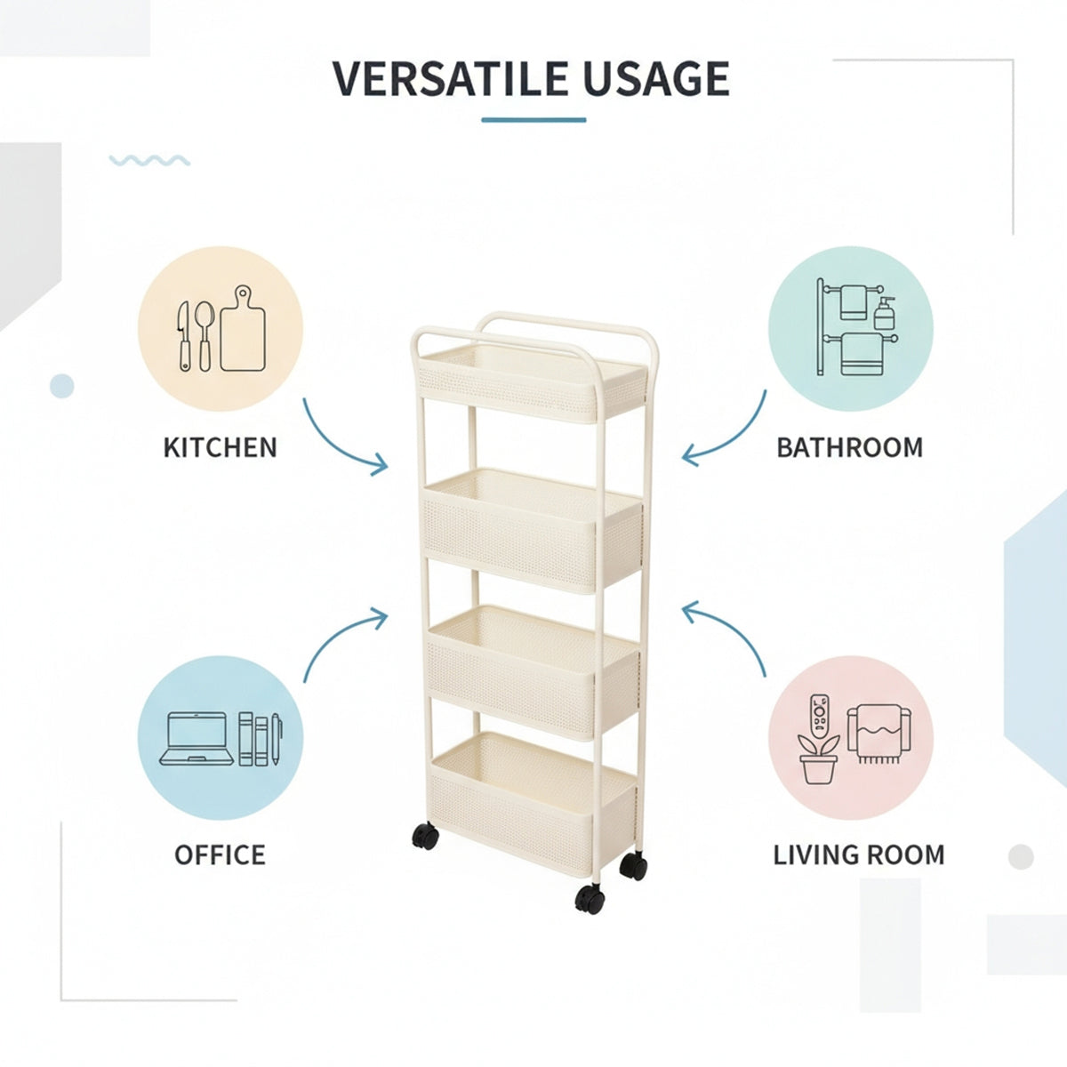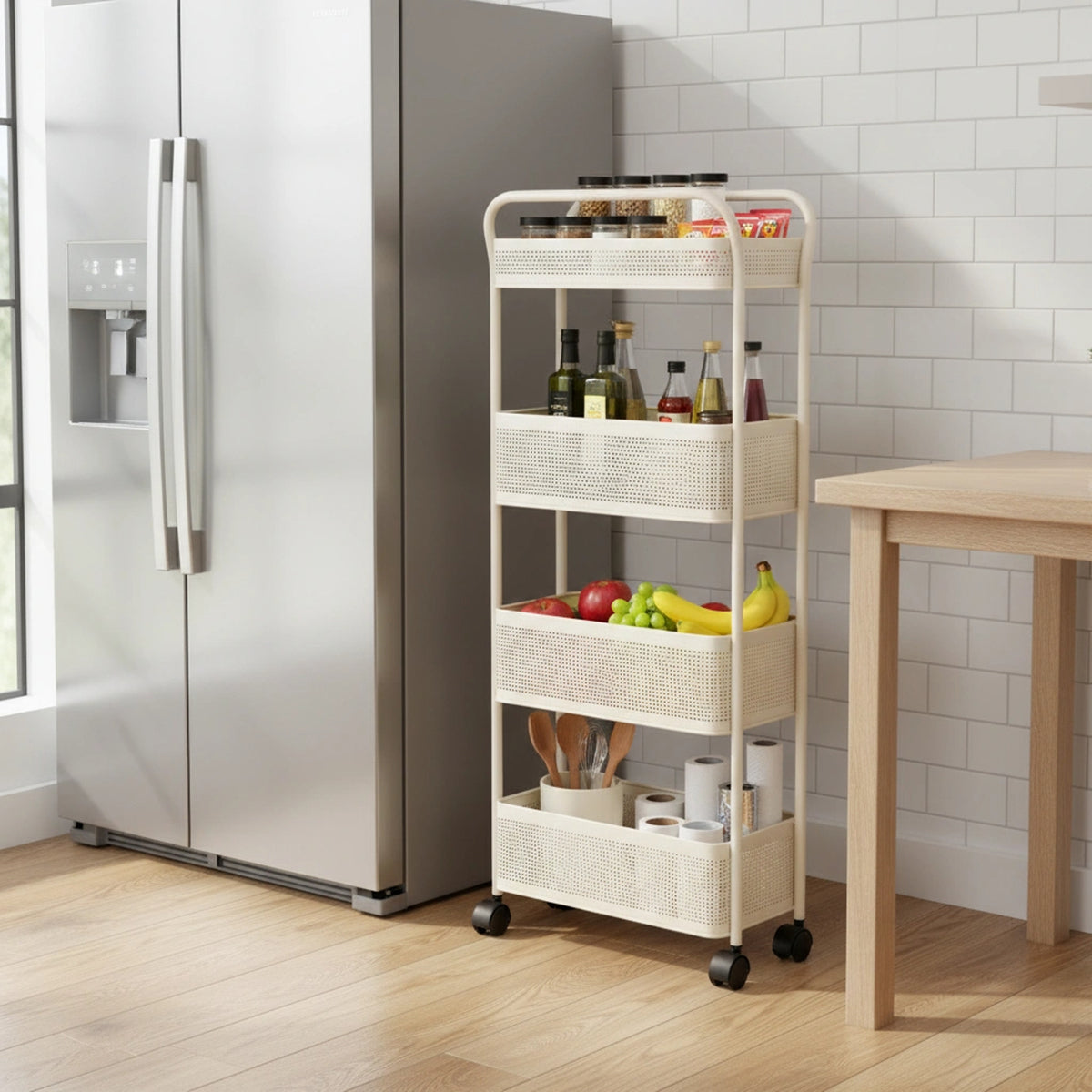 Equipped with four 360° swivel caster wheels, including two with lock function, this utility rack allows you to move it easily from one place to another and lock it firmly in place when needed—ideal for both mobility and safety. - Spacious 4-Tier Basket Design to Hold More Essentials