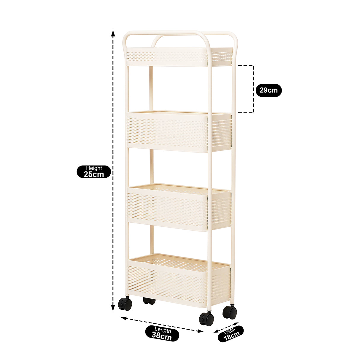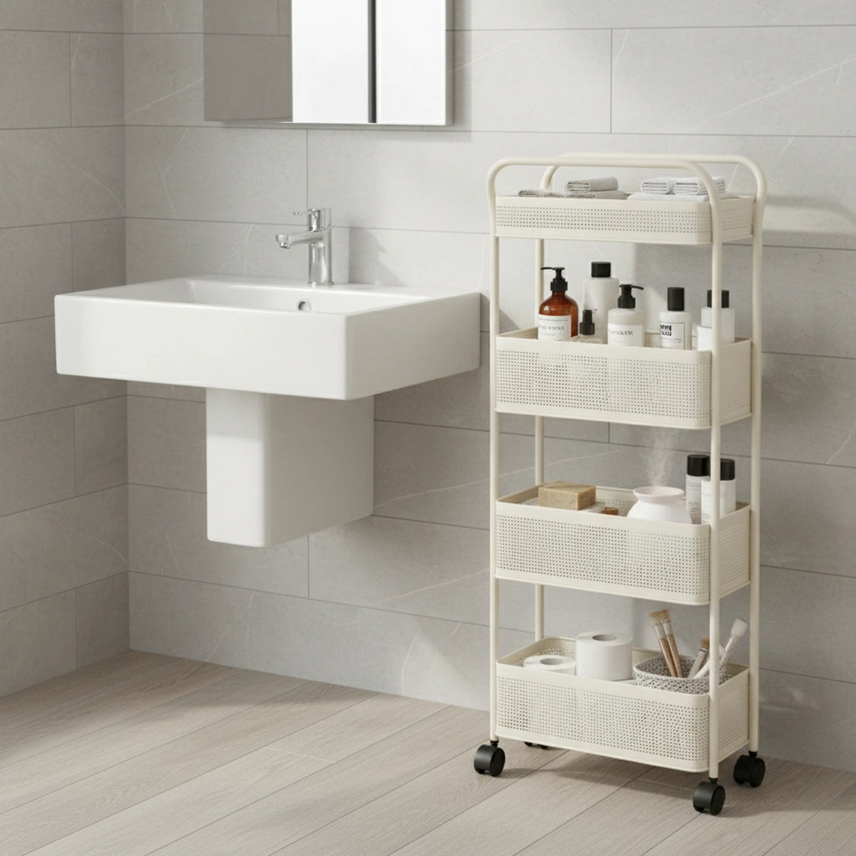 Designed with four deep perforated metal baskets, this organizer offers generous storage space for a wide range of items including books, groceries, files, stationery, cosmetics, kitchen jars, or cleaning products—keeping your space neat and efficient. - Slim Vertical Design Perfect for Small or Tight Spaces