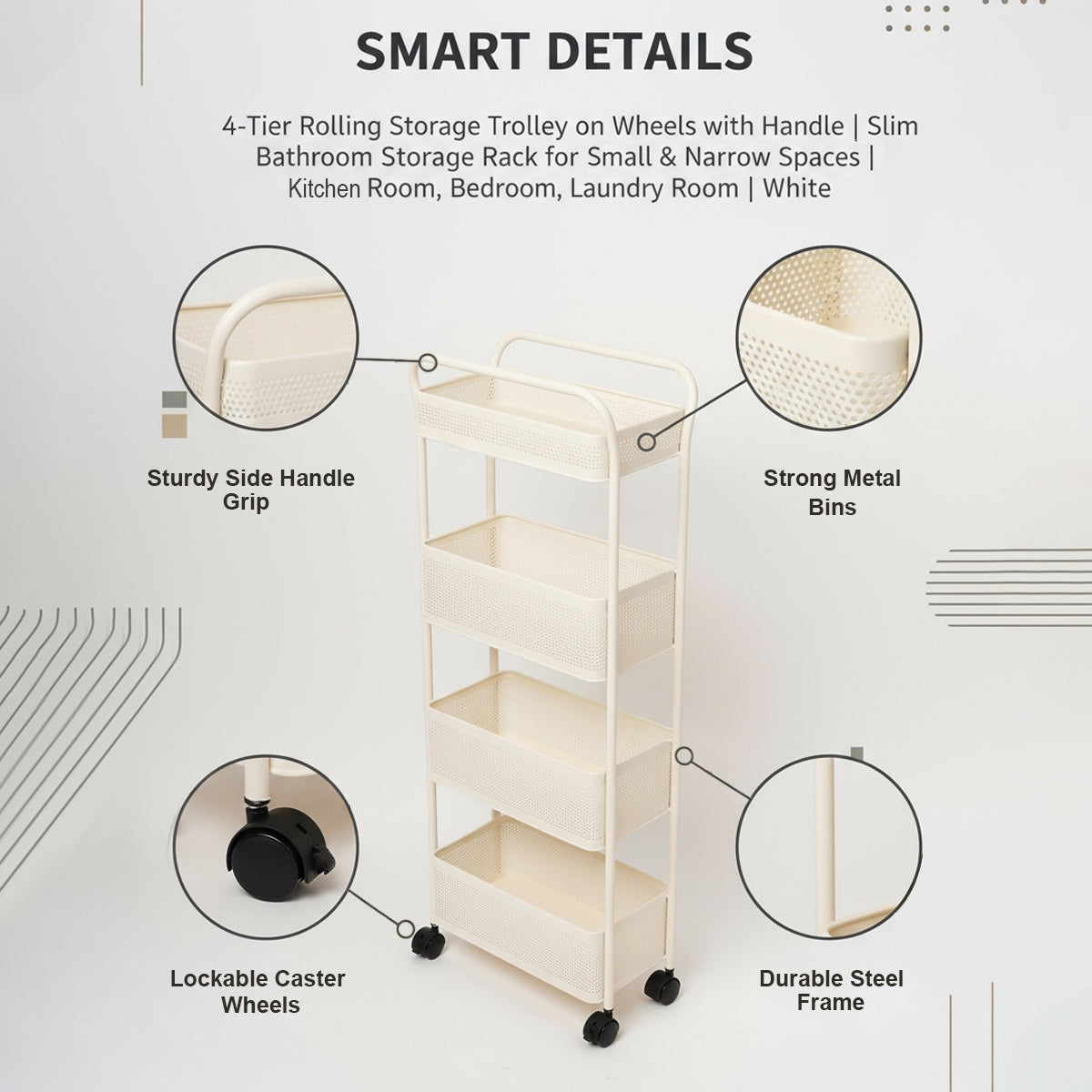 Built using high-quality metal with a smooth, anti-rust powder coating, this trolley is designed to last through everyday use. It offers superior durability, excellent weight capacity, and a clean, modern look that complements all types of interiors. - Smooth Rolling Wheels with Lock Mechanism for Maximum Stability