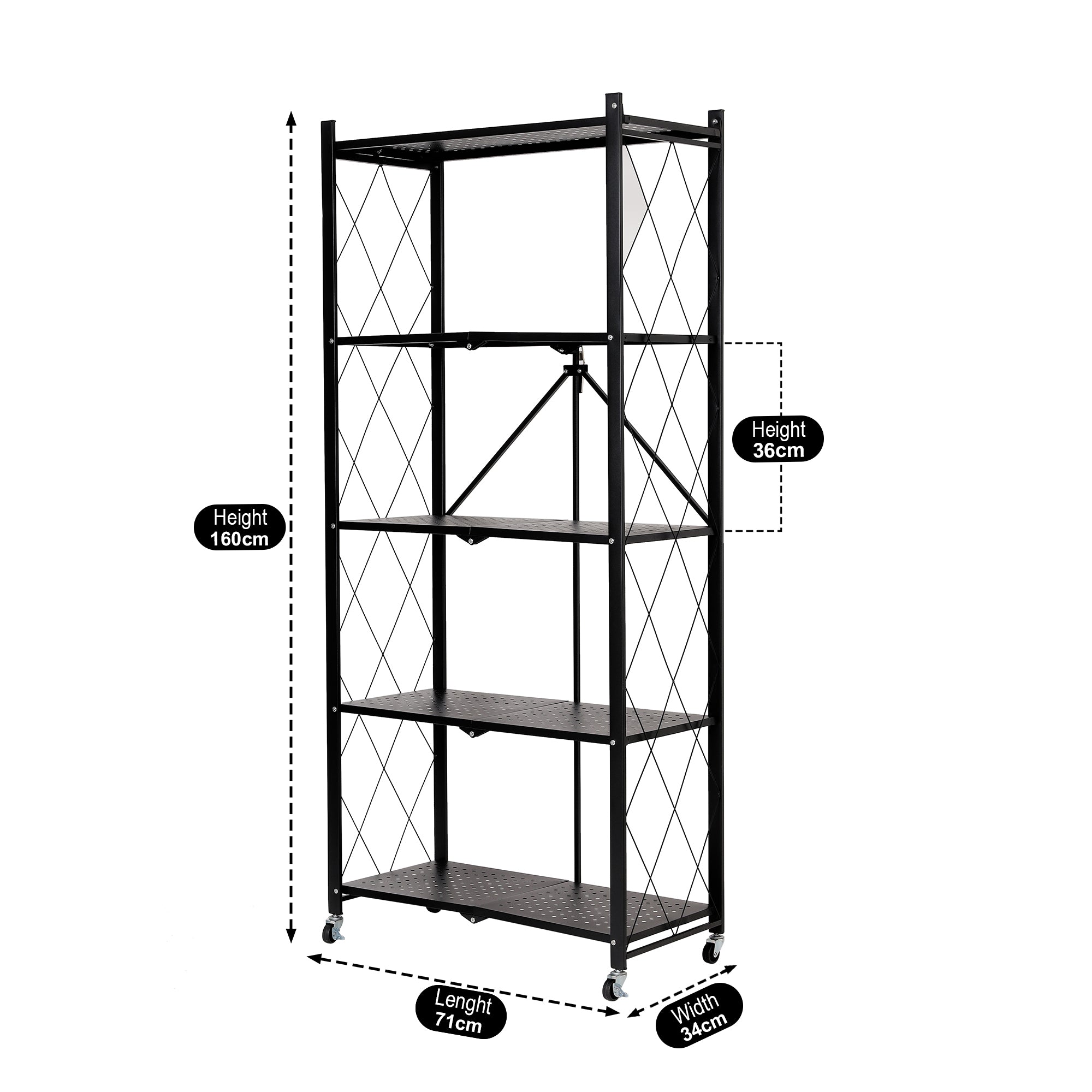Thanks to its foldable design, this unit can be collapsed and stored within seconds when not in use—perfect for compact apartments or temporary setups. The smooth-rolling caster wheels make moving and securing the shelf effortless, while the wide 71.5 cm platform and Height 163 cm offers generous space across each tier.