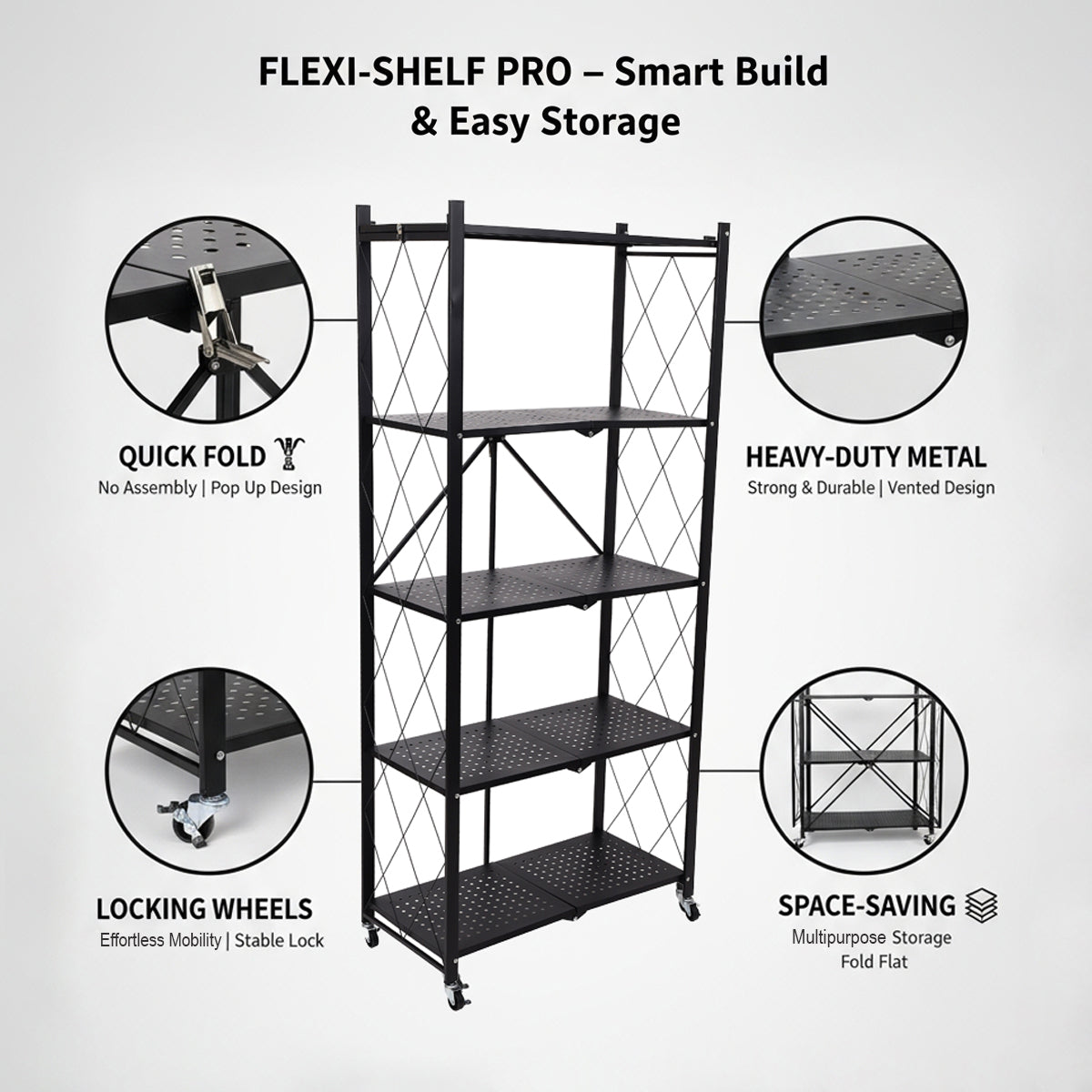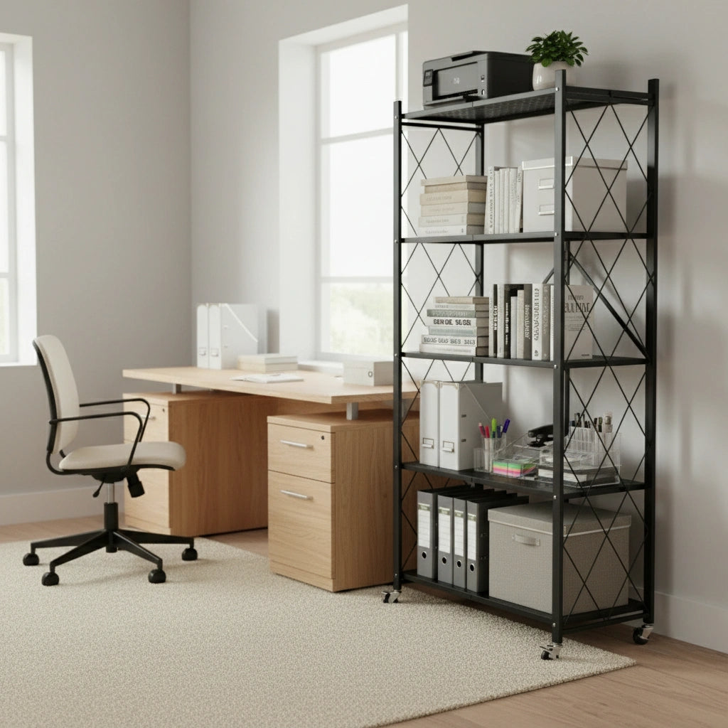 Upgrade your space with the Epicasa® Foldable 5-Tier Storage Rack, a perfect fusion of functionality, space-saving design, and modern aesthetics. Crafted from high-strength metal with thick shelves, this durable rack is ideal for storing household essentials, books, kitchenware, or office files.